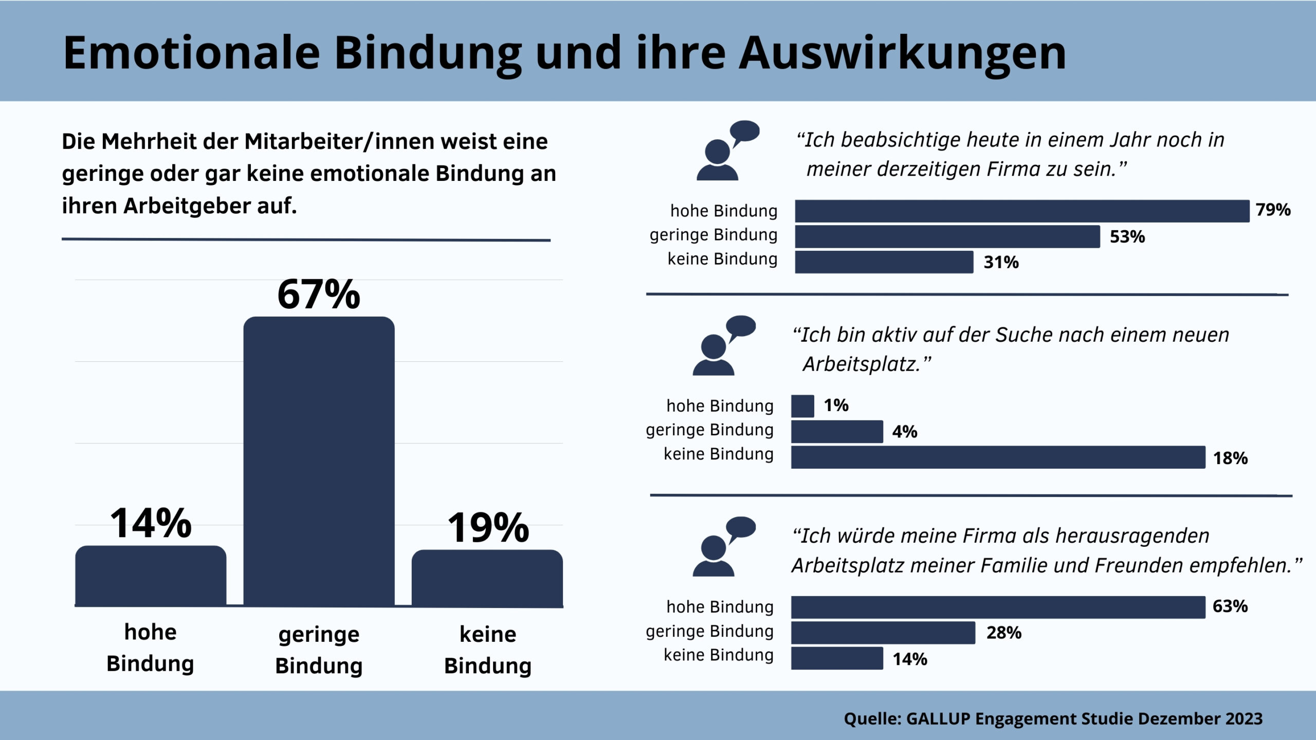 Wie Sie dagegen steuern können? Das Schlüsselwort heißt EMOTIONALE BINDUNG: Denn je mehr Ihre Mitarbeitenden sich mit Ihrem Unternehmen emotional verbunden fühlen, umso größer die Wahrscheinlichkeit, dass sie nicht abwandern.